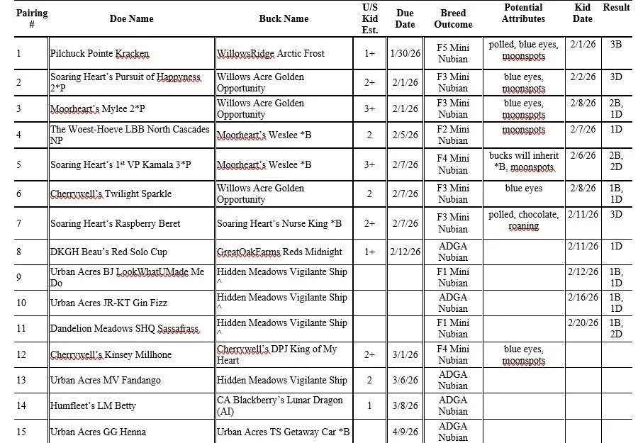 Curious and purposeful, our 2026 breeding plan combines bold ideas with careful action (when the goats cooperate). We’ll focus on genetic health, performance, and temperament through selective pairings and data monitoring. Goals: improve milk production, show performance, calm friendly temperaments.
