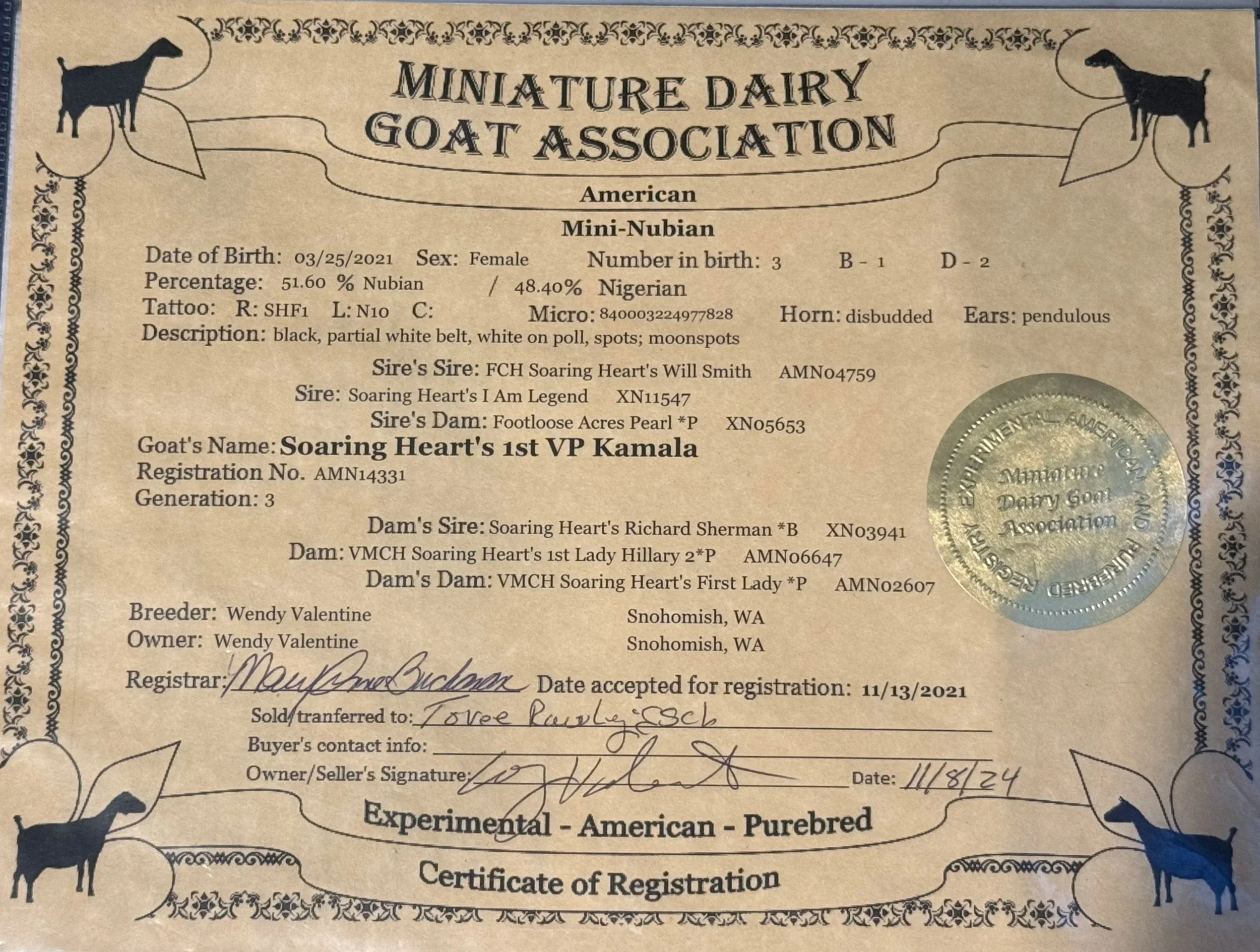 Lovely Kamala came to us from our friend Wendy at Soaring Heart’s in Washington. She is an excellent producer and a dream to milk. She has given us some beautiful kids!