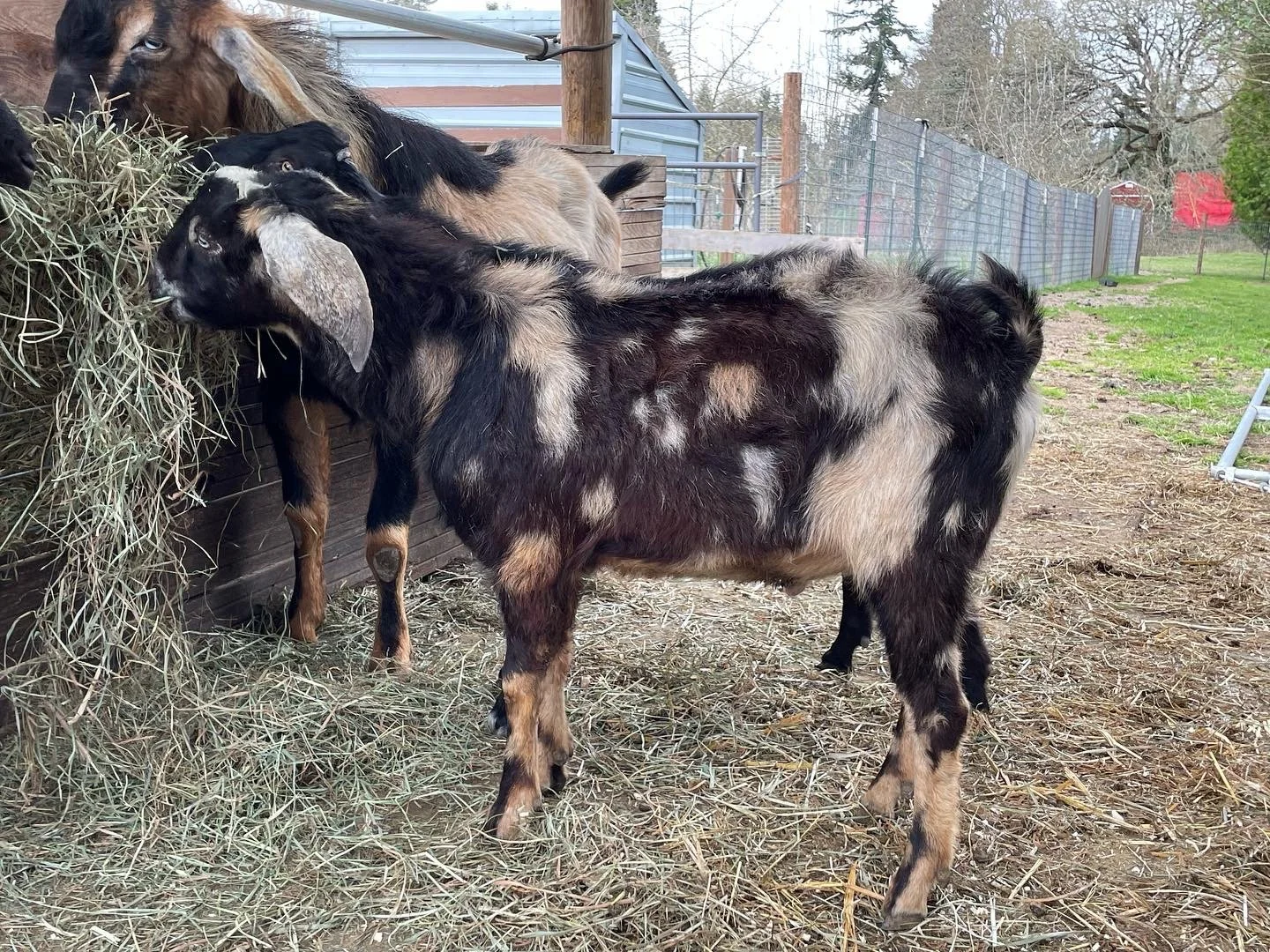 Jared came to us in fall of 2022. He is a blue eyed boy, who we believe is black and tan with extensive moonspots, frosted ears and muzzle, and also appears to have some roaning. He is smaller in stature, and is very friendly and cuddly. He loves to try to eat your clothes or hair if he feels he isn’t getting adequate pets and attention! The most exciting thing about Jared is the fact that his pedigree is full of milk stars across the board. He has some incredible milk genetics and also already has a couple of show wins under his belt. Jared has matured beautifully this year and is looking much more substantial and masculine as a two year old. His first kids with us were gorgeous, and we can’t wait to see his first daughters freshen in the spring!